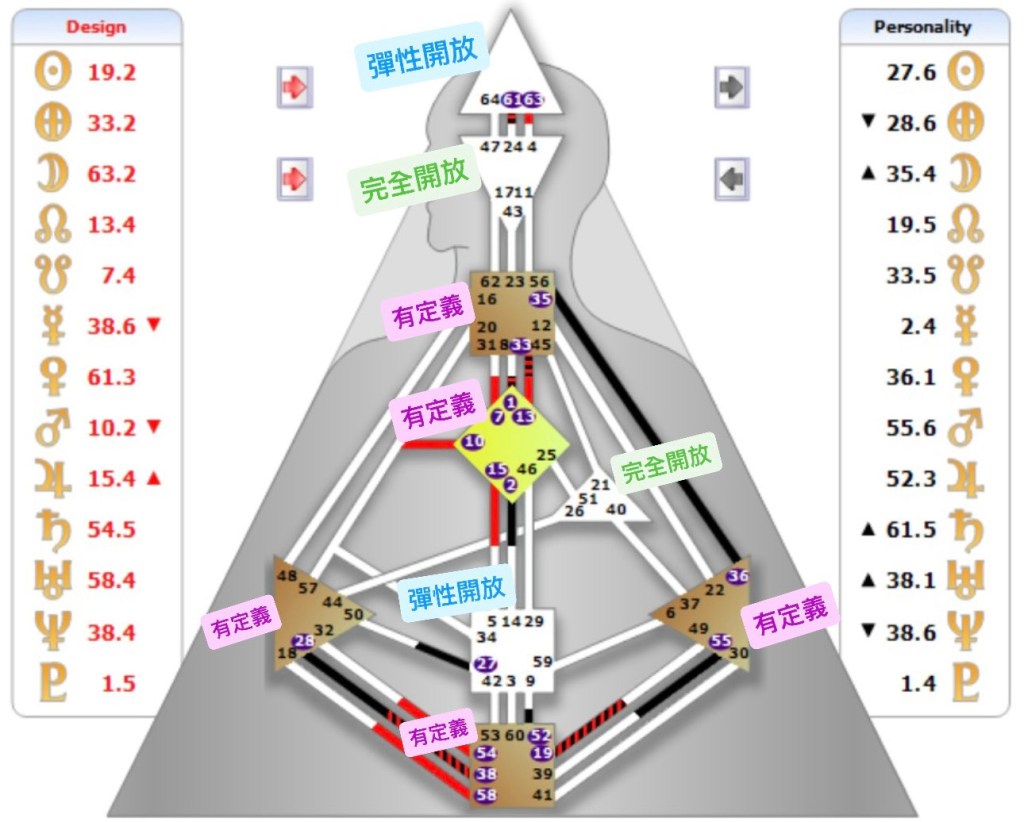 你會看到,每一個能量中心裡都有數字,整張圖共有64個數字,也就是64個閘門,它們對應著易經的64卦。這些閘門中,每一個開啟的閘門(被圈起來的數字,旁邊延伸出一條淺色/深色/深淺相間的線,在人類圖官方網站是以紅色、黑色、紅黑相間表示),都是你身上擁有的一項特質。大部分的數字是兩兩相對,可以彼此連成一條「通道」,將兩個相鄰的能量中心連接。當這兩個閘門都是開啟的,便會使這兩個能量中心能夠相互合作,因此讓這兩個能量中心都成為可以穩固運作的「有定義的能量中心」,也就是你的人類圖中那些被填上顏色的能量中心。