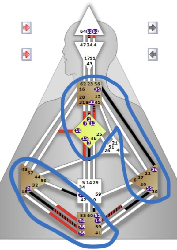 如圖所示,我的情緒中心、喉嚨中心、G中心這三個是連通的,他們就是一個能量中心群;此外,我的直覺中心與根部中心連通,這便是另一塊能量中心群。因此,我有著兩塊分開的能量中心群,可以得知我是二分人。