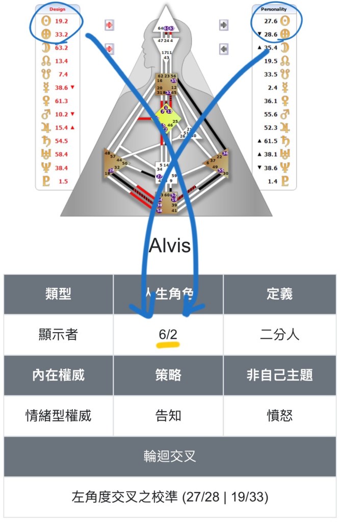 我的個性太陽閘門是27.6、個性地球閘門是28.6,兩者所處第六爻;設計太陽是19.2、設計地球是33.2,兩者所處第二爻。由此可知,我是6/2人。