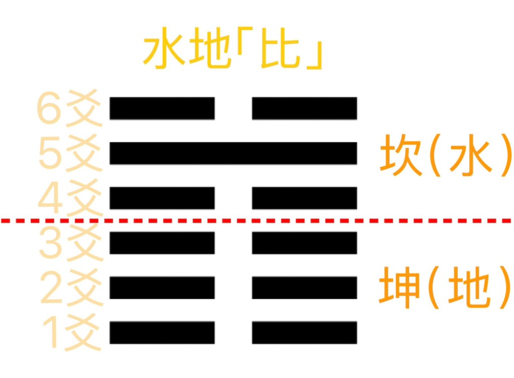 易經中的第8卦為「比」(ㄅㄧˋ)卦。此卦為上「坎」(水)、下「坤」(地),故稱「水地比」。水依地而流,地因水而潤,彼此相依相成;同時,眾水也會在地面上匯流聚集。「比」卦象徵團結親附、互信互助,使群體關係穩固而長久。此卦承接具戰爭意象的第7卦「師」卦,是在秩序建立後進入結盟與親附的局面,而這種親附是一種出於自願、由內在吸引力所促成的結盟,而非靠強制或利益驅動。